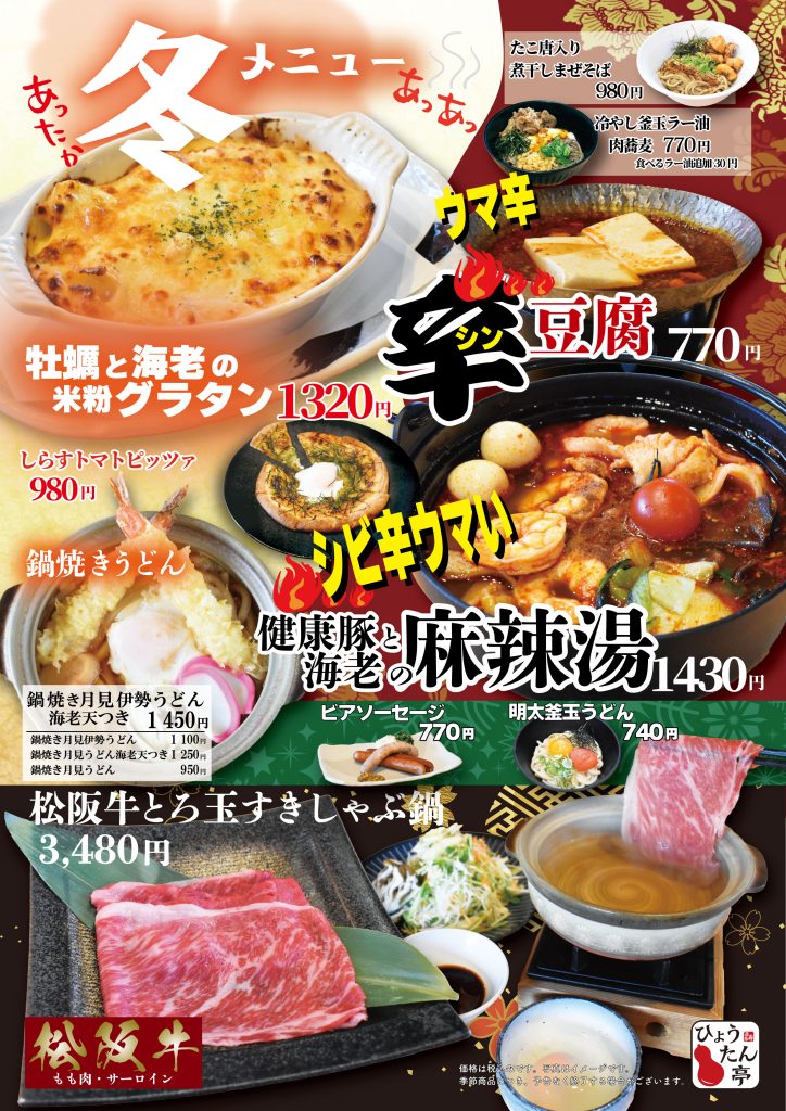 館内お食事処ひょうたん亭より、冬メニューのご案内です。